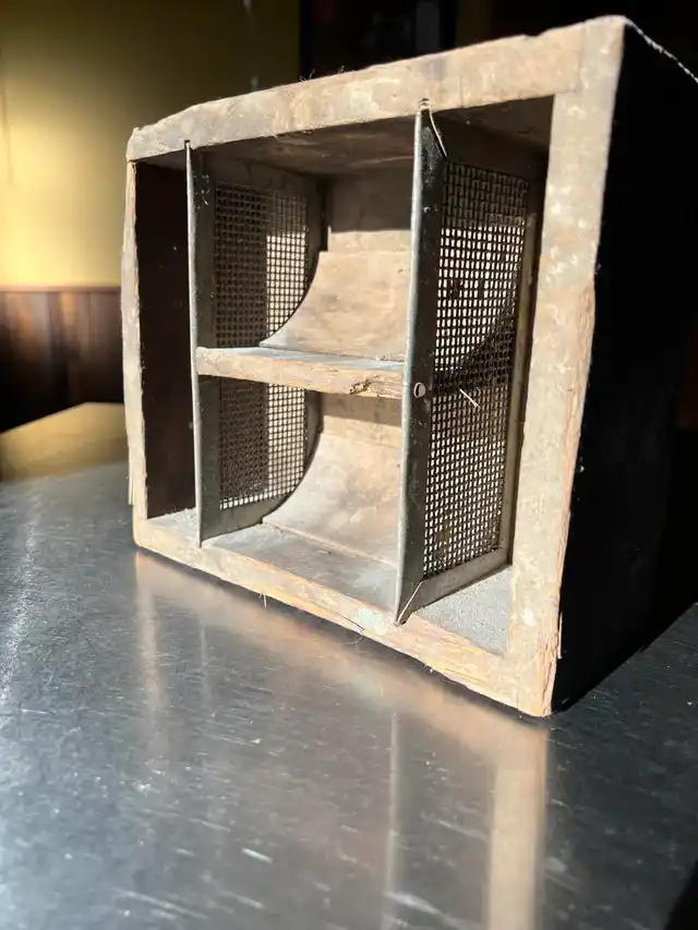 What is this old, handmade wooden box with grates and slanted surfaces?