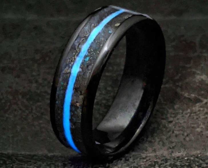 I am completely self-taught and left my job at Walmart seven months ago to pursue a career as a jeweler. Yesterday I finished my most challenging project yet: a ring using Trinitite core glass and Manhattan project shield glass.