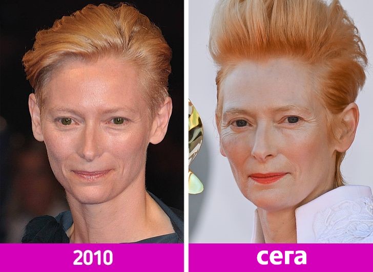 Known for her Nordic beauty, Tilda Swinton typically has a natural and androgynous look with minimal makeup and blonde hair. However, she recently decided to switch things up and experiment with a new look. Swinton has now grown her hair out, dyed it strawberry blonde, and started wearing brighter makeup to accentuate her already interesting features.