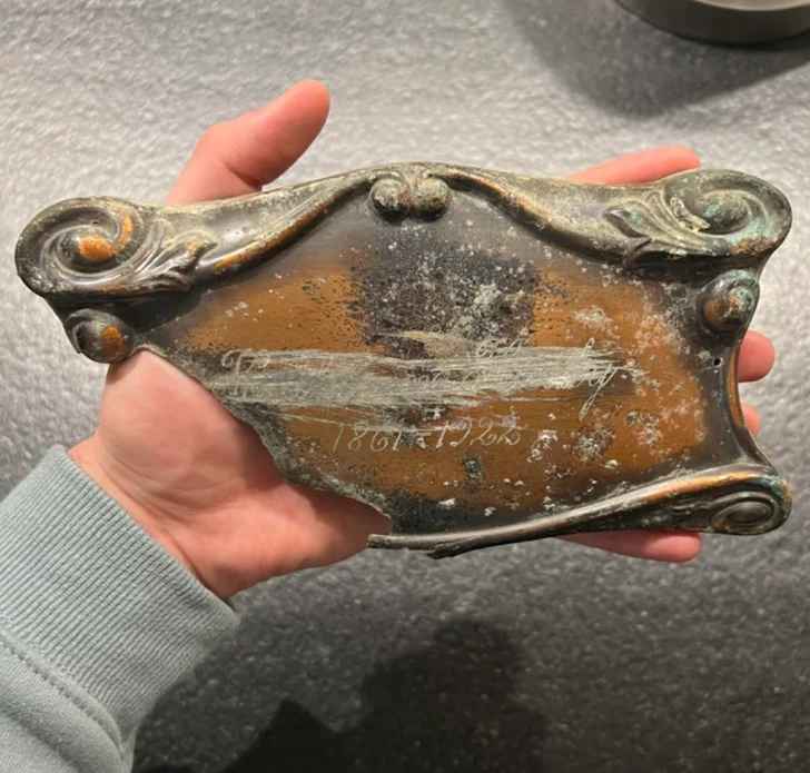 13. “This copper plate with the name and date of death scratched out that I found in the ground on my parents’ farm.”