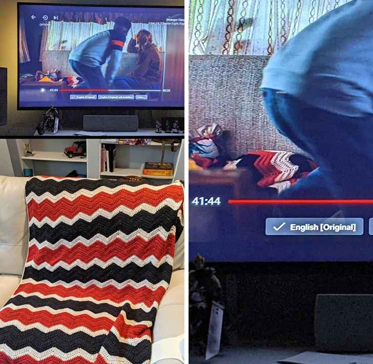 6. “I was watching Stranger Things and saw an exact match with my handmade crochet blanket (gift 10 years ago).”