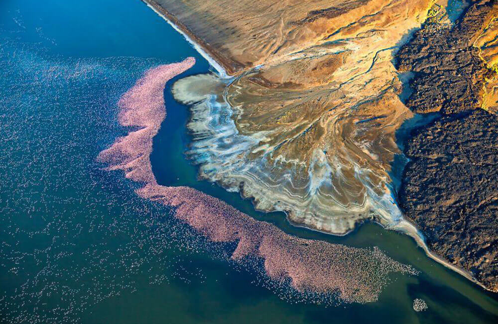 14. Drone photography creates an amazing shot of flamingos in Lake Logipi