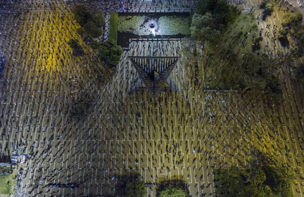 People are still determined to demonstrate for the causes they care about, even in the face of obstacles introduced by 2020. This tenacity is exemplified by the image known as the “Black Flag”. A photo taken on April 19, 2020, in Rabin Square, shows thousands of Israeli protesters following social distancing protocols in their own chalk-lined squares.