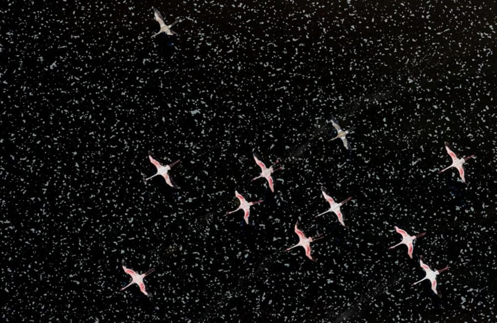 Paul McKenzie’s “Outer Space Flamingos” won an award at the Siena Drone Photo Awards 2020. It had one of the most imaginative titles among the entries. Irish photographer McKenzie has spent a lot of time photographing these amazing birds; he often has to wait hours in the mud to get the perfect shot.