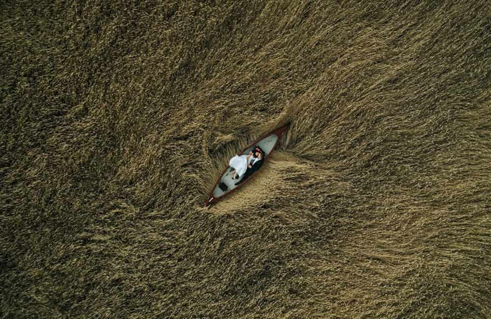 “Lovers in a Field,” a moving image of a newlywed couple sleeping in the middle of a field and dressed in wedding dresses, was shot by Krzysztof Krawcyzk. Along with the pair, the photographer said he was “looking for some abstraction” and that the creative process involved the use of “a boat, a drone, and a lot of time”.