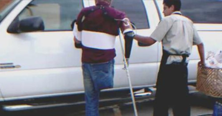Johnny observed that the man was having difficulty using his crutches, and the shopping cart, and reaching the shelves to get what he needed. He watched the crippled man while ringing up the groceries for the other customer.