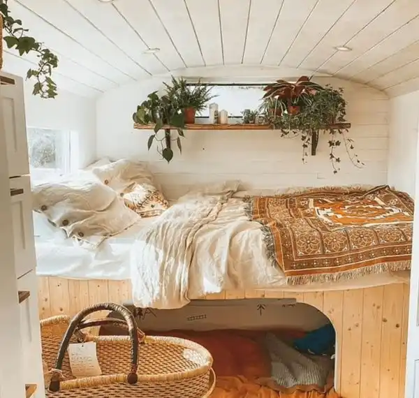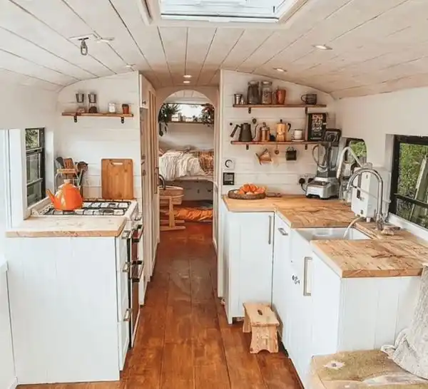 This labor of love took over six months to complete. The chairs have been removed and replaced with gorgeous hardwood floors, a functional kitchen, a comfortable bedroom, and an elegant bathroom. The layout of their mobile home has been carefully thought out to make it a cozy and welcoming place. The interior is warm and inviting, from the wooden floors to the use of natural materials and plants.