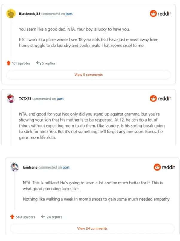 At the point when the father looked for counsel on the web, the vast majority concurred with his methodology, saying showing liability and uniformity in family chores was significant. They recommended zeroing in on training as opposed to discipline.