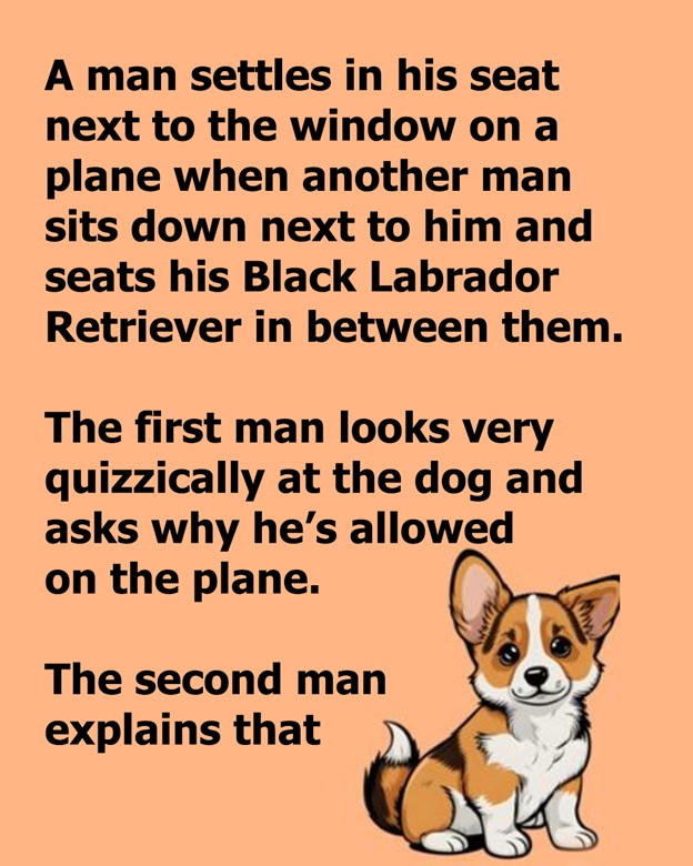 A man gets comfortable his seat close to the window on a plane when another man plunks down close to him and seats his Dark Labrador in the middle between them.