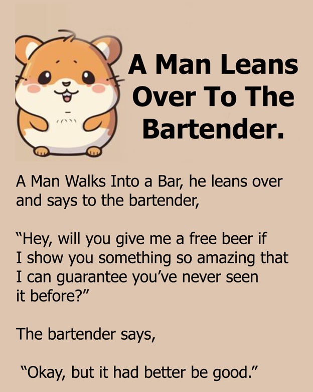 A Man Strolls Into a Bar, he hangs over and tells the barkeep, “Hello, will you give me a free brew assuming I show you something so astonishing that I can ensure you’ve never seen it?” The bart