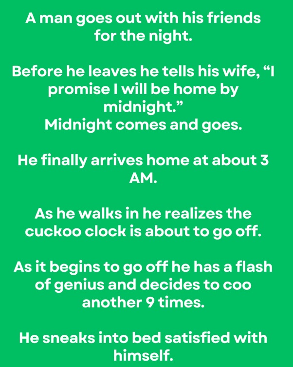 12 PM travels every which way. He at long last gets back at around 3 AM. As he strolls in he understands the cuckoo clock is going to go off. As it goes off he has a blaze of virtuoso and chooses to coo another multiple times. He slips into bed happy with himself.