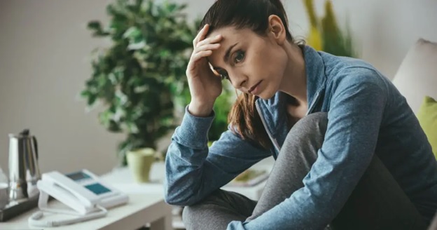 Miserable discouraged lady at home sitting on the sofa, peering down and contacting her brow, depression and agony idea