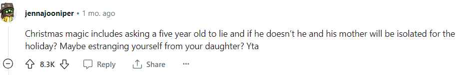 The woman clarified that her grandson’s mother is fine with not believing in Santa Claus as a real person. But since the woman’s young children believe in Santa Claus, the OP is now worried that if her grandson pulls a Santa Claus theme during the evening of the party, it will spoil the magic for her children.