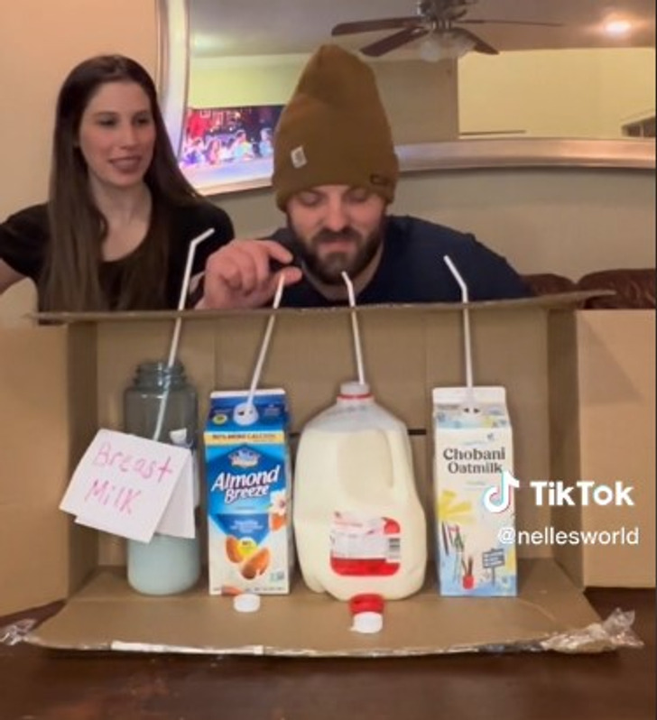 In another viral video, Janelle tricked her husband into drinking her breast milk during a blind taste test she conducted for him. Joshua had to drink oat milk, whole milk, almond milk, and breast milk while guessing which was which without knowing which.