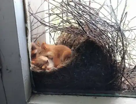 Two young squirrels were dozing in the nest. Voices were coming from this direction.