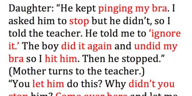 The mother asked the school staff a burning question: would they think it right for someone to touch their privacy without permission? The boy’s inappropriate behavior seemed to worry the staff less than her daughter’s reaction.