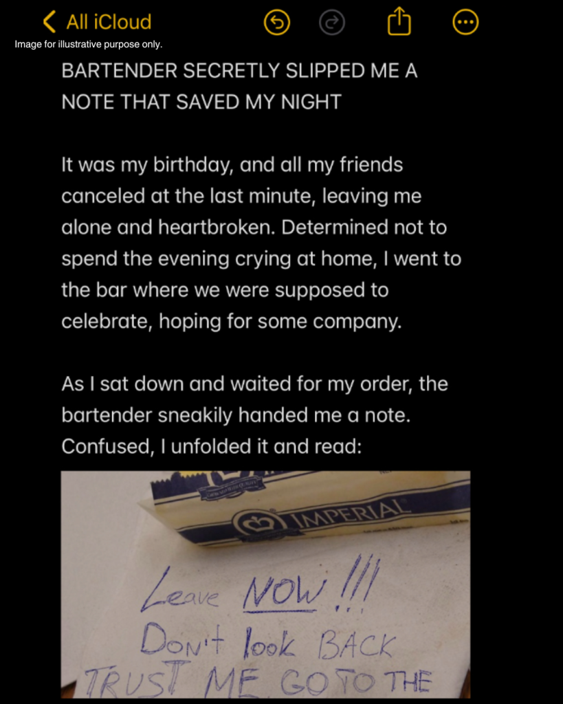 I knew Jake from around town, but we never talked much. He nodded and went to work on my drink. When he returned, instead of handing me a glass, he handed me a folded note.
