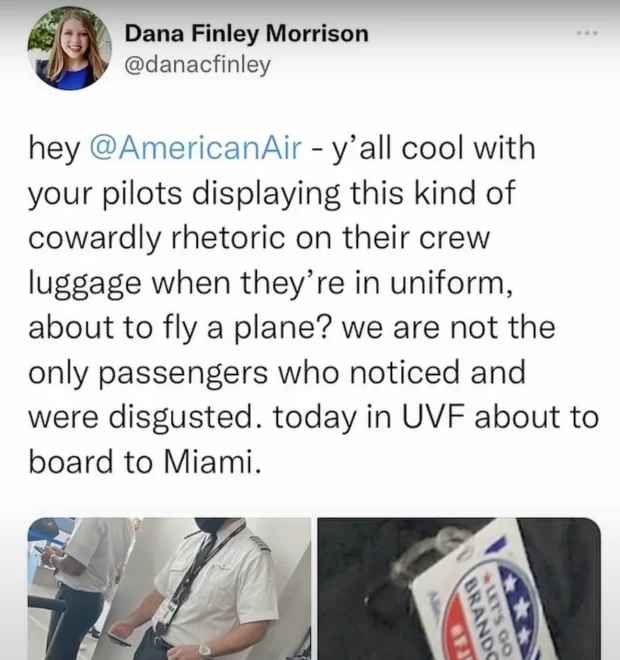 “Are you okay with your pilots displaying this kind of cowardly rhetoric on their crew’s luggage when they are in uniform and about to board a plane?” Morrison made the announcement in a tweet to American Airlines. It wasn’t just us passengers who noticed and found it off-putting.