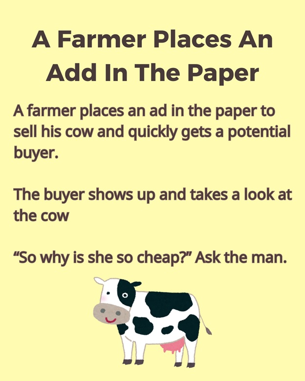 The purchaser appears and investigates the cow “So for what reason is she so modest?” Ask the man. The rancher murmurs and