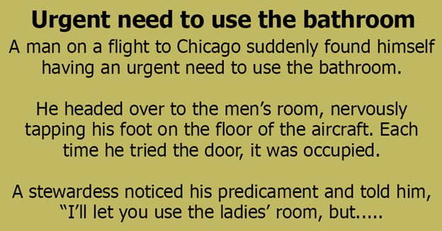 An attendant saw his issue and told him, “I’ll allow you to utilize the women’s room, yet on one condition – don’t contact the buttons on the wall!”
