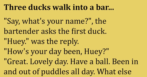 “Say, what’s your name?”, the barkeep asks the primary duck.