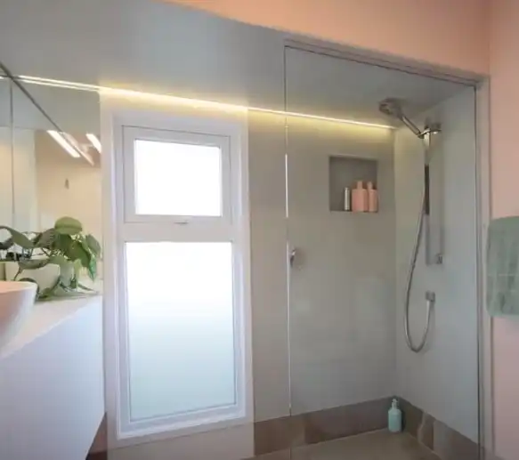 However, Rebecca’s creative design skills are most evident in the bathroom. The stone tiles on the floor, the concrete-look shower, and the pink walls all work well together.