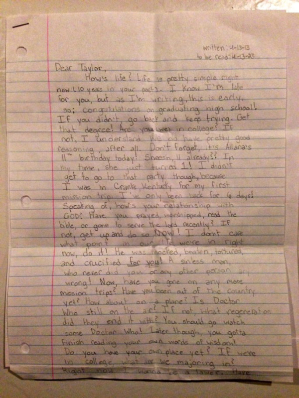 The desires of youth are often filled with dreams of college, travel, and expanding their social circle. Taylor Smith, a seemingly ordinary 12-year-old girl from Johnson City, Tennessee, was no exception. Her days were filled with the warmth of family and friends and she enjoyed watching the beloved television series Doctor Who. In April 2013, she put pen to paper and created a letter to her future self that would be kept in a box in her room, accompanied by a clear instruction: “Open Taylor Smith April 12, 2023, only (unless otherwise noted).”