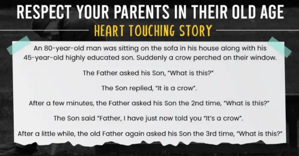 As our parents taught us to walk, it is our duty to help and support them as they grow old. When they need us the most, we must be there for them. Let me tell you a heartfelt story as a poignant reminder to cherish and respect our parents as we approach this time in our lives. The story begins with an 80-year-old man relaxing on the sofa in his cozy home with his highly educated 45-year-old son. Their attention is drawn when a bird lands at their window. A father asks his child, “What is this?” somewhat unexpectedly.