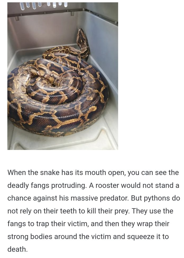 He believed the roosters had escaped from the coop before realizing he suspected a python.