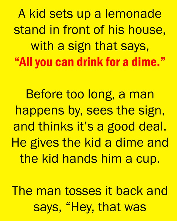 “Presently stand by a moment,” says the man, “According to your sign ‘all I can drink for a dime.'”
