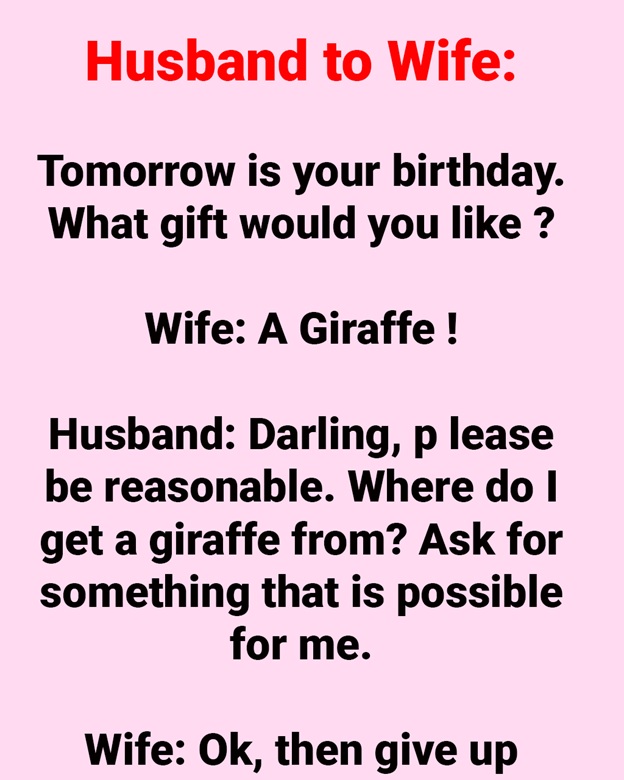 Spouse: Sweetheart, if it’s not too much trouble, be sensible. Where do I get a giraffe from? Request something feasible for me.