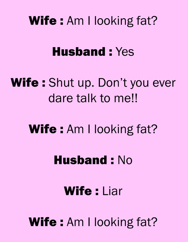 At any point do you challenge converse with me!! Spouse : Am I looking fat? Spouse : No Wife : Liar Wife : Am I looking fat? Spouse : Perhaps Wife
