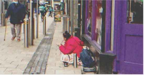 As he was leaving, he saw a beggar taking his iPhone out of his bag. She was begging for money to buy food for her child, so he wondered how a beggar could afford an iPhone. He decided to follow the beggar from around the corner. He then noticed the woman and her child being picked up along with their possessions by a black SUV that had stopped.