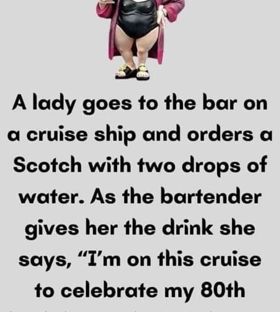 She explains, “I’m on this cruise to celebrate my 80th birthday, and it’s today,” as the bartender hands her a drink.