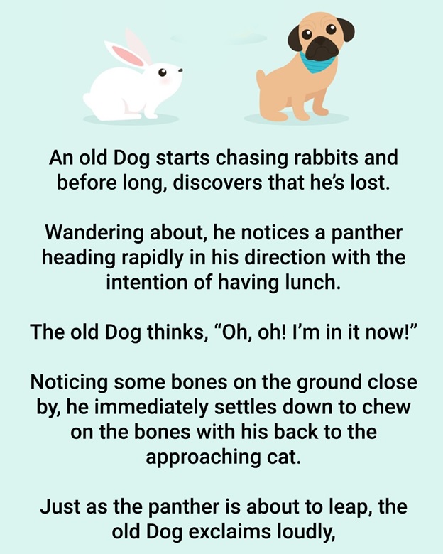 An old Canine beginnings pursuing bunnies and after a short time, finds that he’s lost. Meandering about, he sees a puma heading quickly toward him fully intent on eating. The old Canine th