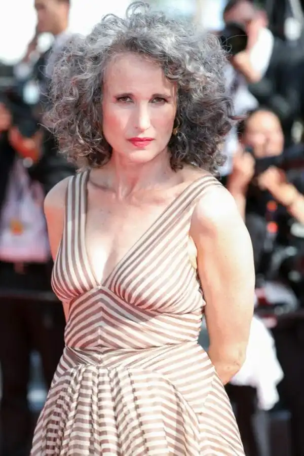 MacDowell shows the world that beauty knows no age as she embraces her senior status with grace. She exudes natural elegance as she proudly displays her makeup-free face and now silver-grey hair in a low bun. She was recently pictured in Cannes looking stunning in a casual white striped dress, which she accessorized with platform shoes and dark sunglasses.