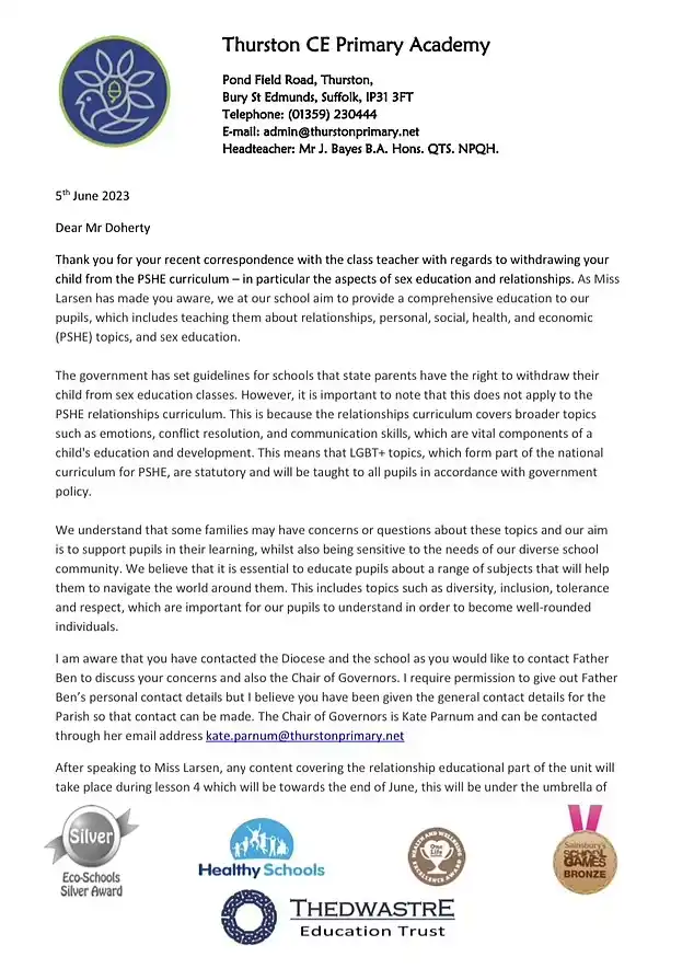 Thurston Primary School in Suffolk has come under scrutiny over a s*x education curriculum that Mr Doherty believes is inappropriate for his daughter and her classmates. The explicit nature of the lessons and the way they are delivered shocked him when he asked for a review of the teaching materials used in the school.