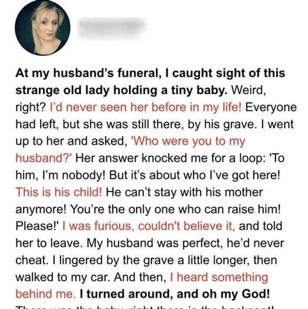Encircled by murmured sympathies and the aroma of newly turned earth, I was unable to force myself to leave the last resting spot of the man I adored. It was during this snapshot of distress that I experienced an old woman, supporting a minuscule child in her arms. Disarray and anxiety washed over me as I noticed her, thinking about how she was associated with my dependable spouse.
