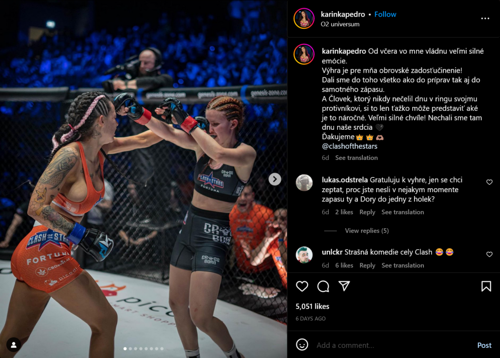Just before the Clash of the Stars event, expectations were raised by two Czech models, Karina Pedro and Denisa Ryndová, who made headlines with their unexpected pre-fight. The usual intense atmosphere of face-off between MMA fighters took an unusual turn when the two opponents engaged in a flirtatious embrace that surprised both the audience and the fight community.