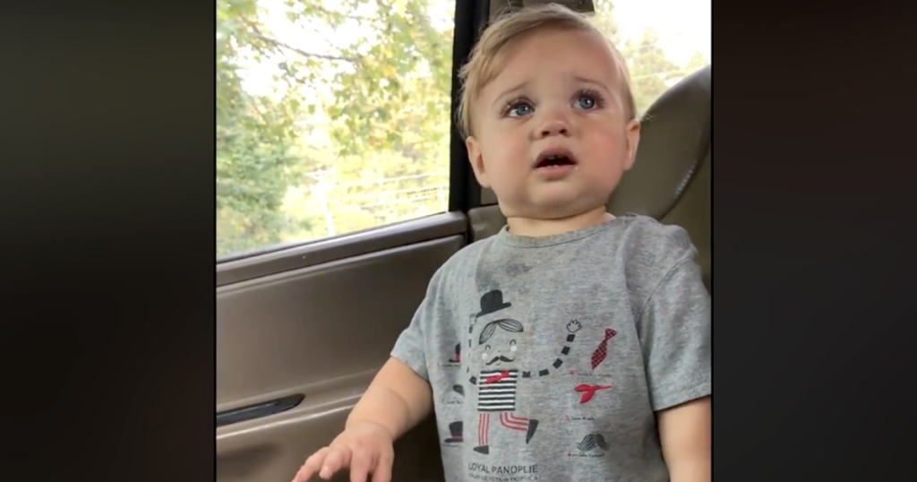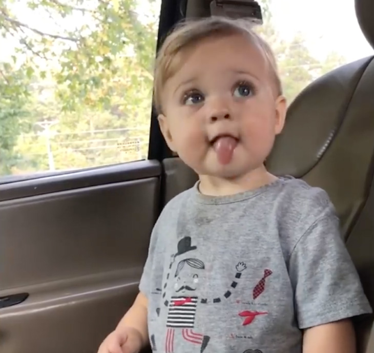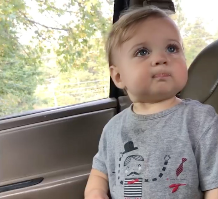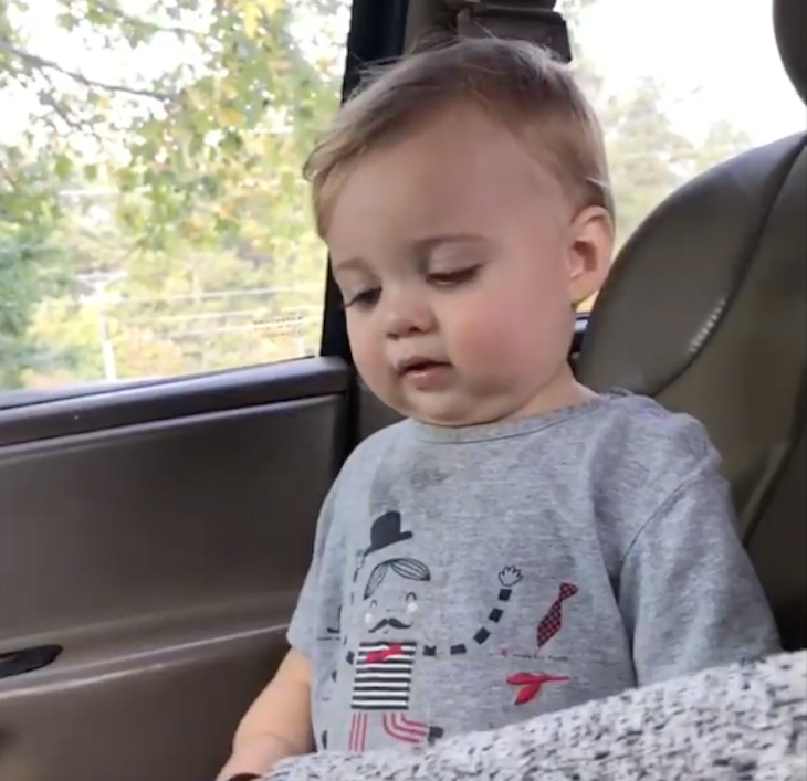 So while mom is right—it’s important to sit while driving—this toddler looks at her with his cute eyes before going on a cute tirade.