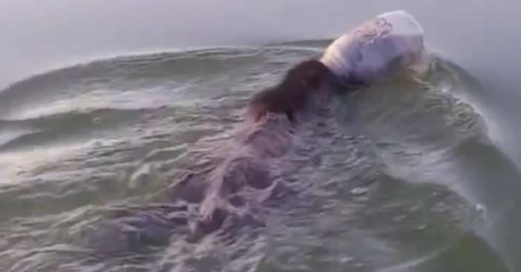 A tired bear swims around, desperately trying to get out until the container is filled with water. The Hurt family acted without thinking! After several attempts, they managed to remove the container and allowed the bear to swim towards the shore.