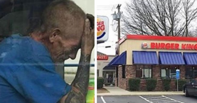 A homeless man stopped by Burger King. Like many other homeless people, he was wearing disheveled and worn clothes.