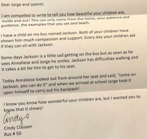 Jackson is the kid who drives my bus. Both of your children were incredibly kind and helpful to him. Your kids ask if they can sit with Jackson every day. Jackson is a little depressed when he gets on the bus some days, but smiles when he sees Annaliese and Jorge. Jackson has difficulty walking so it takes him a while to reach his seat.