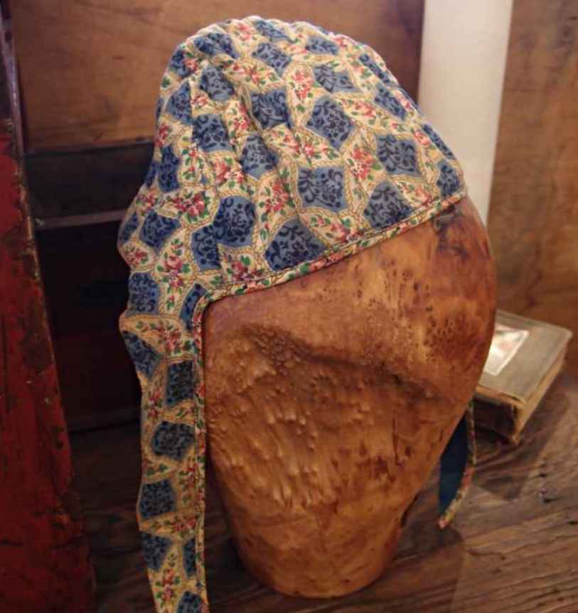 This unusual cap is actually an early handmade bathing cap. In the 1920s, people liked to model swim caps after the popular aviatrix style. But rubber materials were hard to come by for domestic sewage. So they came up with a creative solution – the channels and stitching were machine sewn and the cap was filled with sand. Why sand? It acts as a water blocker and allows swimmers to choose their own fabric design rather than being limited to black or yellow rubber.
