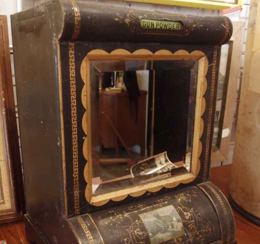 This elegant box is actually a Victorian dispenser. It was designed to sell goods in bulk and came in a variety of sizes. In this particular one, it had a label insert for gunpowder, but it could also be used for sugar, candy, or other bulk commodities. The glass front allowed customers to see the quality of the goods they were buying. And why the picture of hunting dogs? Well, it’s just a decorative touch, as the intention was to only store gunpowder.