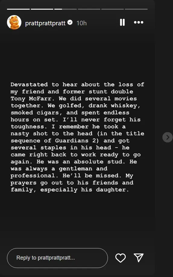 In a heartfelt Instagram post, Pratt wrote: “Devastated to hear of the passing of my friend and former stunt double Tony McFarr.”