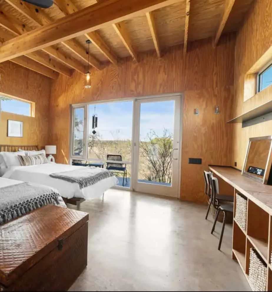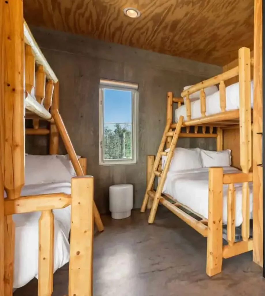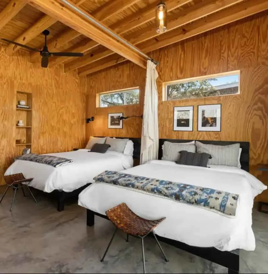 These eight friends set out on a journey to create their little community lovingly christened “Llano Exit Strategy”. They enlisted the expertise of San Antonio architect Matt Garcia to make their dream a reality. Their vision was to create a peaceful retreat consisting of four compact, eco-friendly bungalows, shared living space, a guest bedroom, and a communal kitchen. These spaces have been thoughtfully designed to not only minimize environmental impact but also maximize their comfort and connection with nature.