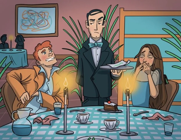 In the deception, a man and lady feast while the man understands his wallet is missing, unbeknownst to them, causing doubt from the server.