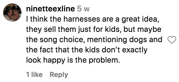 A third user shared his other disagreements with the man, writing: “I think the harnesses are a great idea, they only sell them for kids, but maybe the song choice, the mention of dogs, and the fact that the kids don’t look very happy. is the problem.”