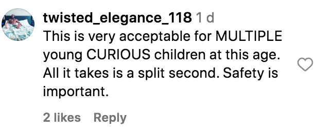One person said: “This is very acceptable for MOST small CURIOUS children at this age. It only takes a split second. Safety is important.”
